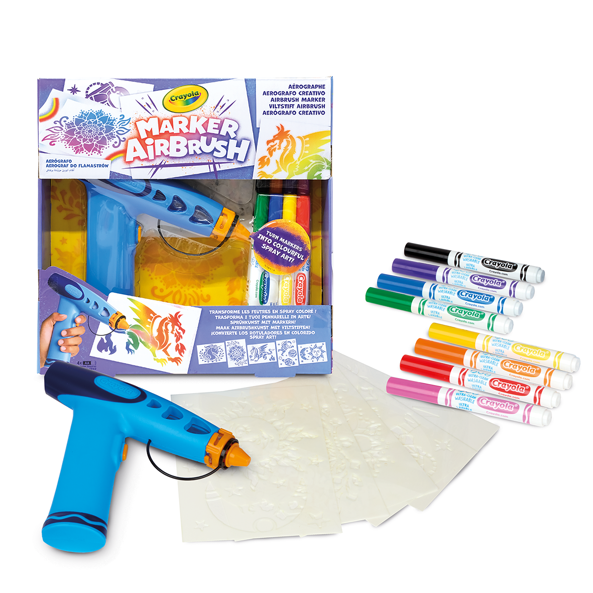 L’aerografo è compatibile con tutti i pennarelli Crayola, così i bambini possono scatenare la loro fantasia e creare opere d’arte uniche!