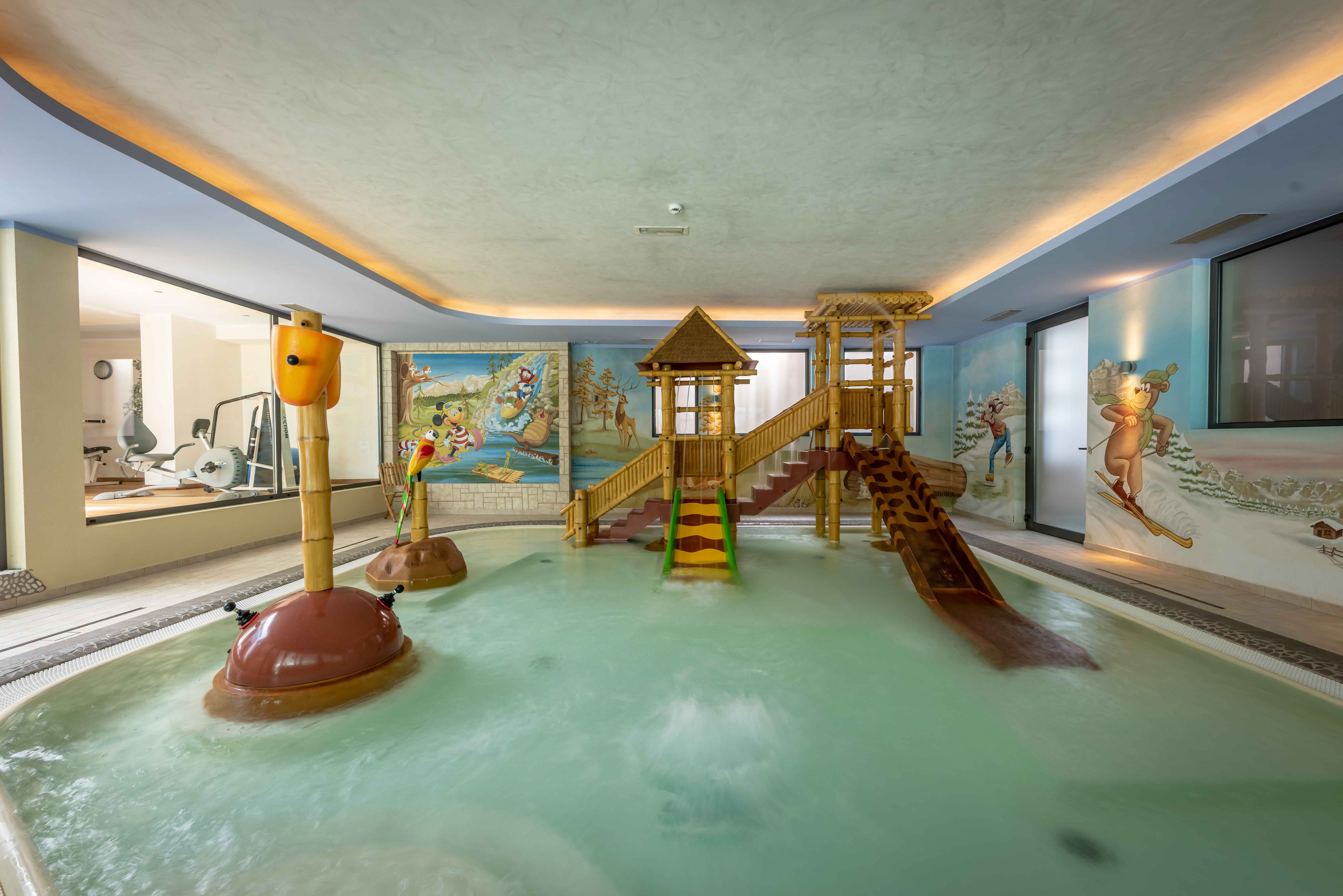 1000 mq, più giardino dedicato al wellness, 3 piscine riscaldate di cui una per bambini con parco giochi acquatico e 5 saune diverse.
